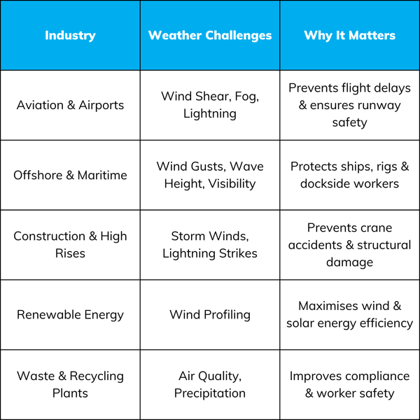 Many sectors are affected by extreme weather events, and they're becoming more frequent and severe. From construction sites to offshore platforms, all sectors interact with weather parameters in one way or another.